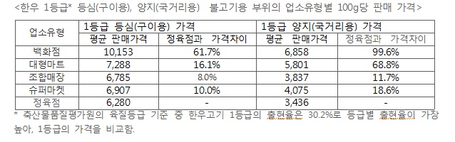 ◯ ÇÑ¿ì ¾çÁö(1µî±Þ)ÀÇ ¾÷¼ÒÀ¯Çüº° 100g´ç Æò±Õ ÆÇ¸Å°¡°Ý