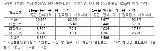 ◯ ÇÑ¿ì 1µî±Þ µî½É(±¸ÀÌ¿ë)ÀÇ ¾÷¼ÒÀ¯Çüº° 100g´ç Æò±Õ ÆÇ¸Å°¡°Ý